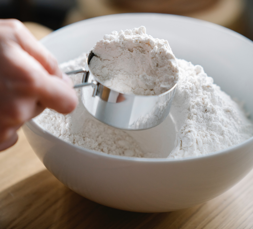 Wlej jogurt do miski. Dokładnie wytrzyj szpatułką resztę jogurtu z pudełka. Dodaj mąkę i wymieszaj.