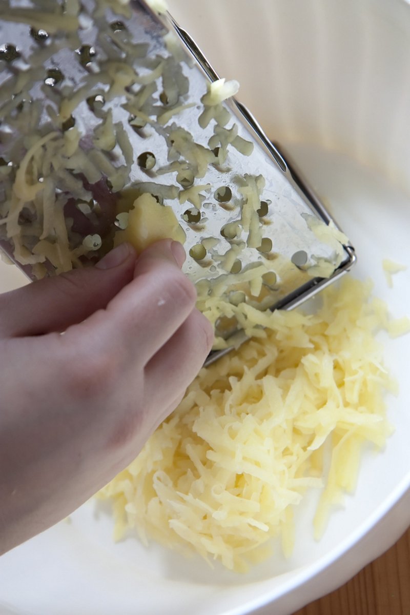 Obierz ziemniaki. Zetrzyj je na tarce o dużych oczkach. Dorzuć do smażącego się mięsa i cebuli. Dodaj soli oraz pieprzu, a na koniec wymieszaj.