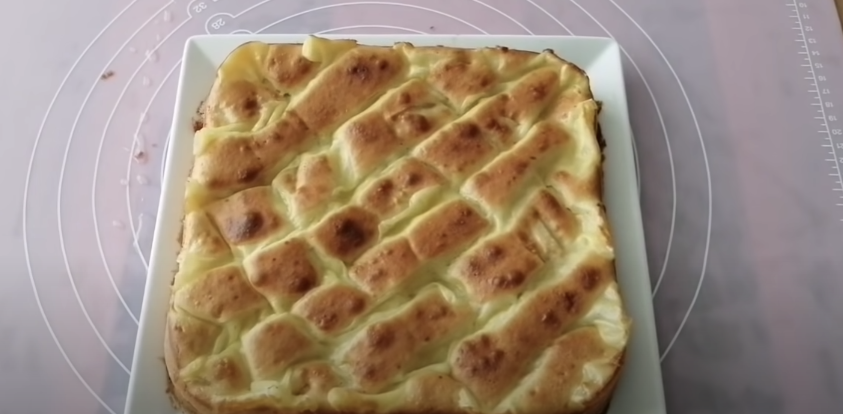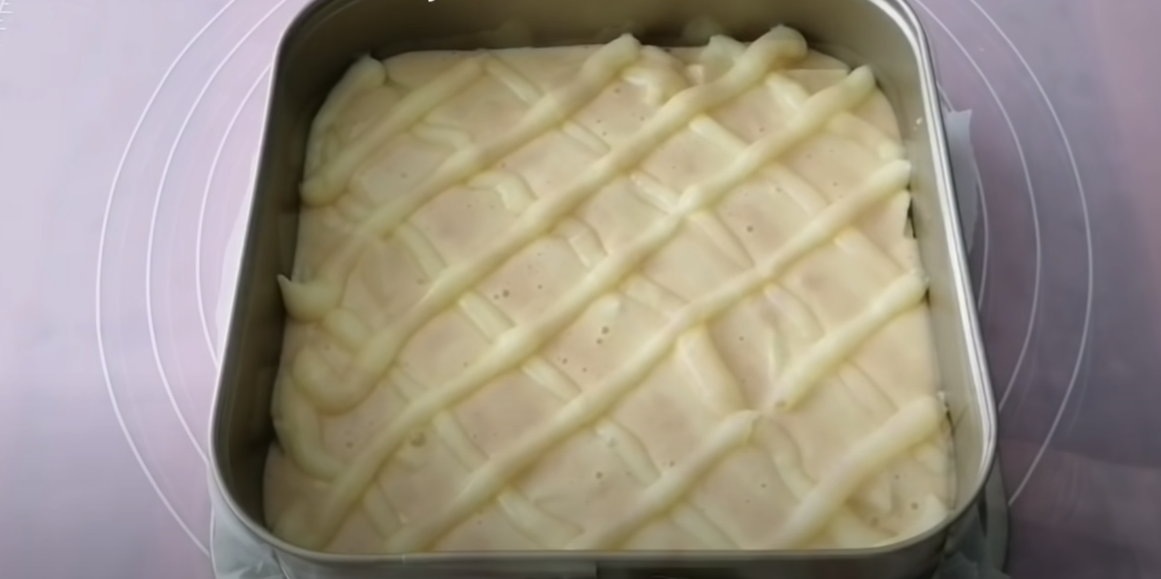 Przygotowane w ten sposób ciasto wlej do formy, przykrywając nim warstwę jabłek. Przy pomocy szprycy cukierniczej z ugotowanego wcześniej kremu budyniowego zrób dekorację w formie kratki.