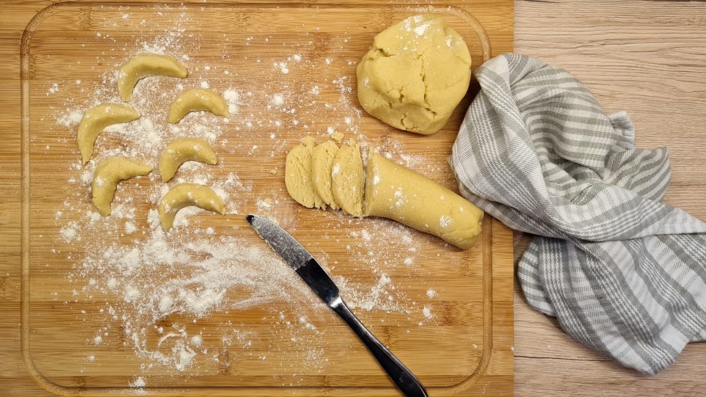 Po schłodzeniu kroimy około jednej trzeciej ciasta, a następnie kroimy na jeszcze mniejsze części. Z każdej wyciętej części na posypanej mąką desce toczymy dłuższy wałek, który kroimy na małe części, z których uformujemy rogale.