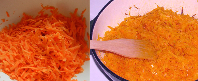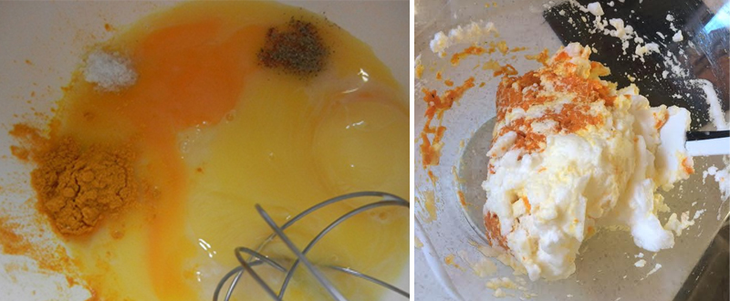 W misce wymieszać żółtka z kurkumą i przyprawami. Do żółtek wmieszać usmażoną na patelni, ostudzoną marchewkę.