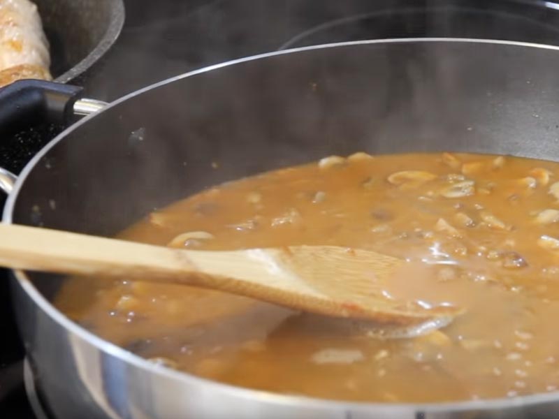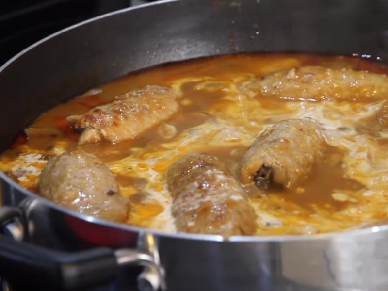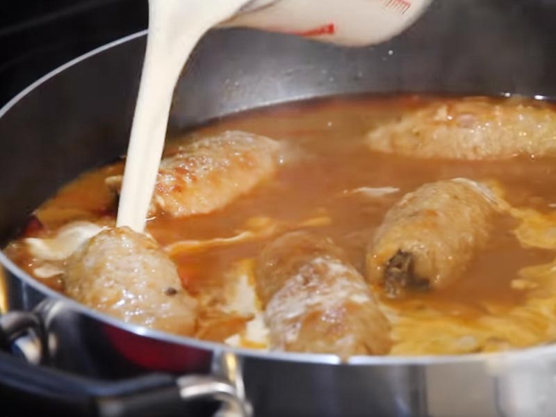 Poczekaj do momentu aż sos zabulgocze i przełóż do niego zrazy. Roladki powinny być całe przykryte sosem, ponieważ będą w nich „dochodzić”, przez co staną się kruche i będą rozpływały się w ustach. Jeśli sos ich nie przykrywa – dolej wody.