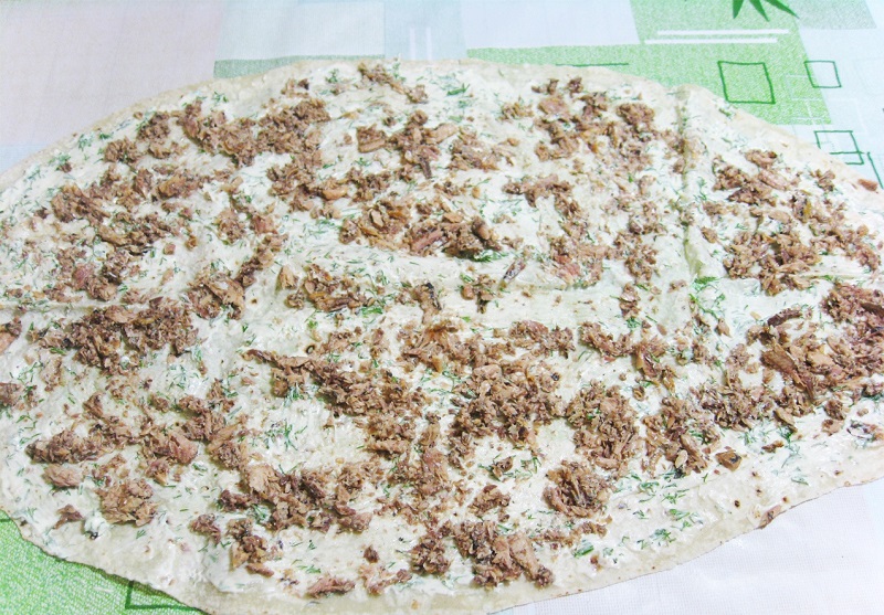 Na placku rozkładamy także równomiernie rybę. Następnie przykrywamy całość kolejnym plackiem, smarujemy go sosem i kładziemy na niego jajka.