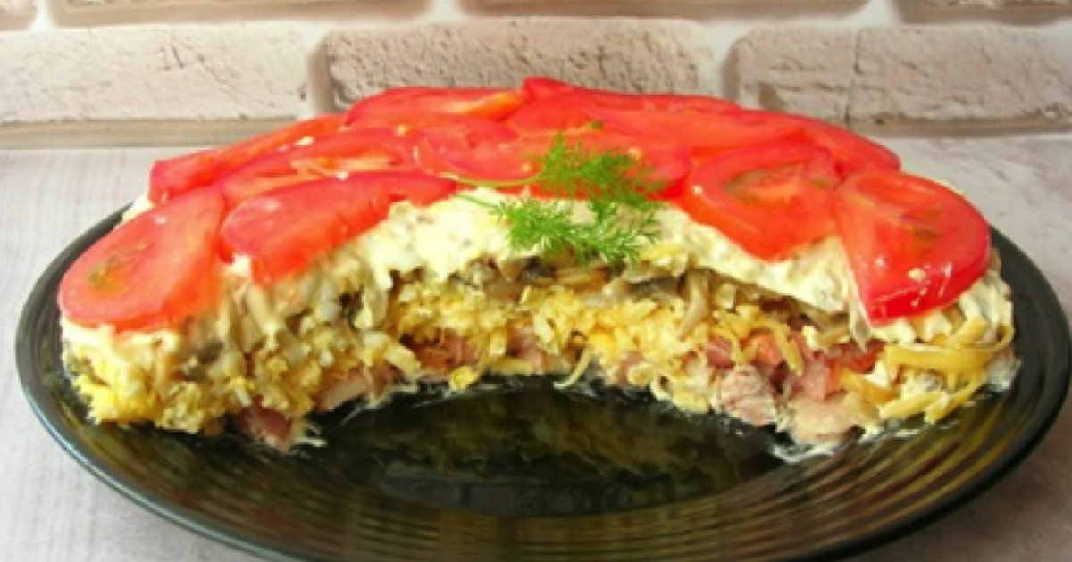 Je również posmaruj majonezem i ułóż na nich pomidory, pokrojone w plastry. Tak przygotowaną sałatkę umieść w lodówce na około pół godziny. Dzięki temu zabiegowi będzie ona o wiele smaczniejsza.