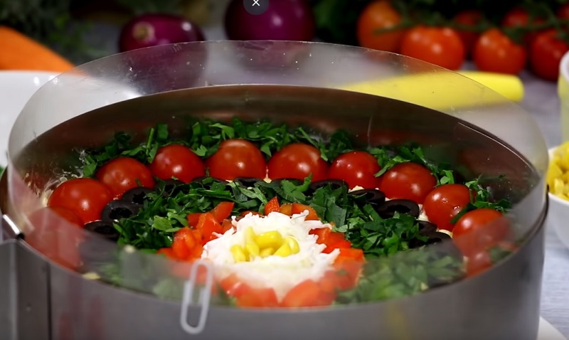 Wysyp resztę ziół jako kolejny okrąg. Następnie wysyp krąg pokrojonej papryki. Środek dekoracji sałatki to tarte białka oraz kukurydza.
