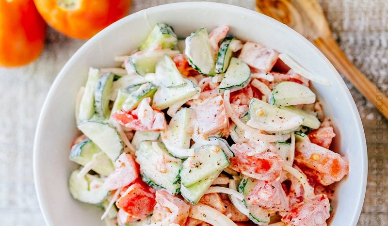 Umyj wszystkie warzywa i zioła. Obierz cebulę. Sałatę porwij na kawałki. Pomidory, ogórki i cebulę pokrój według uznania. Posiekaj zioła. Wymieszaj w miseczce jogurt, musztardę i przeciśnięty przez praskę czosnek. Dodaj starty ser. Warzywa przełóż do głębokiej miski. Dodaj sos jogurtowo-musztardowy. Dopraw do smaku.