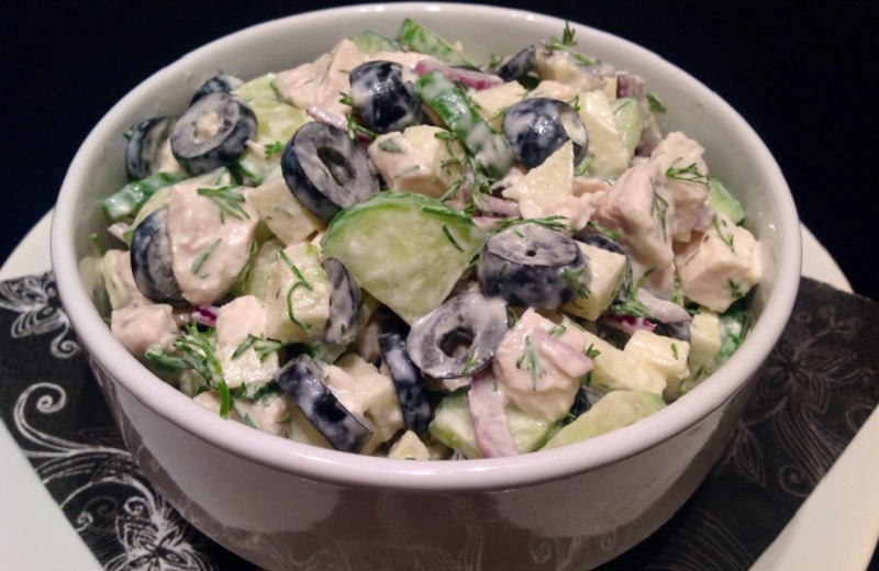 Jabłka obierz i zetrzyj lub pokrój na małe kawałki. Ogórki umyj i pokrój w kostkę, a oliwki przekrój na połówki. Ugotuj pierś z kurczaka. Kiedy mięso zmięknie, wystudź je i posiekaj na drobne kawałki. Wymieszaj w misce kurczaka z jabłkami, ogórkami i oliwkami. Dodaj do sałatki jogurt i wymieszaj. Dopraw do smaku.
