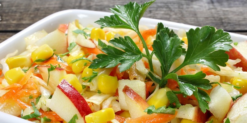 Obrane i umyte jabłko zetrzyj na tarce lub drobno pokrój. Kapustę posiekaj drobno, marchewki obierz i pokrój. Dodaj kukurydzę z puszki. Wymieszaj wszystkie składniki, dopraw do smaku sokiem z cytryną i przyprawami.