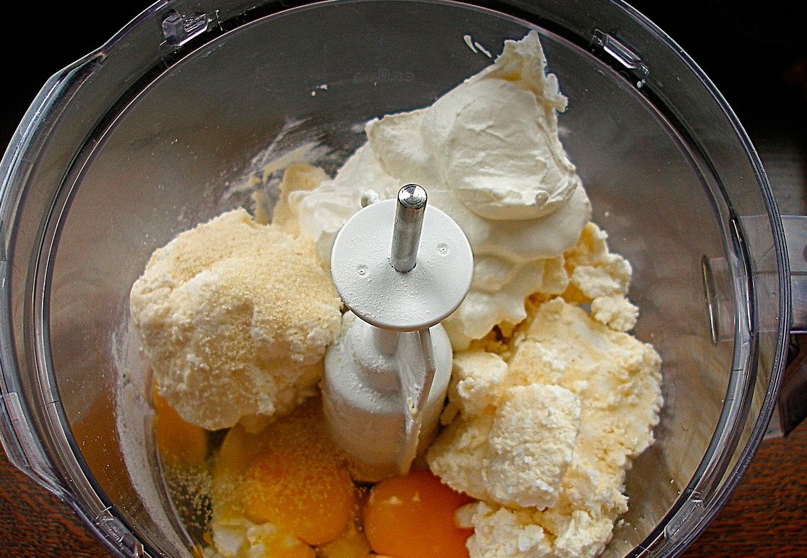 Śmietanę łączymy z jajkiem, białym cukrem i wanilinowym oraz twarogiem. Z pomocą miksera wyrabiamy masę serową.