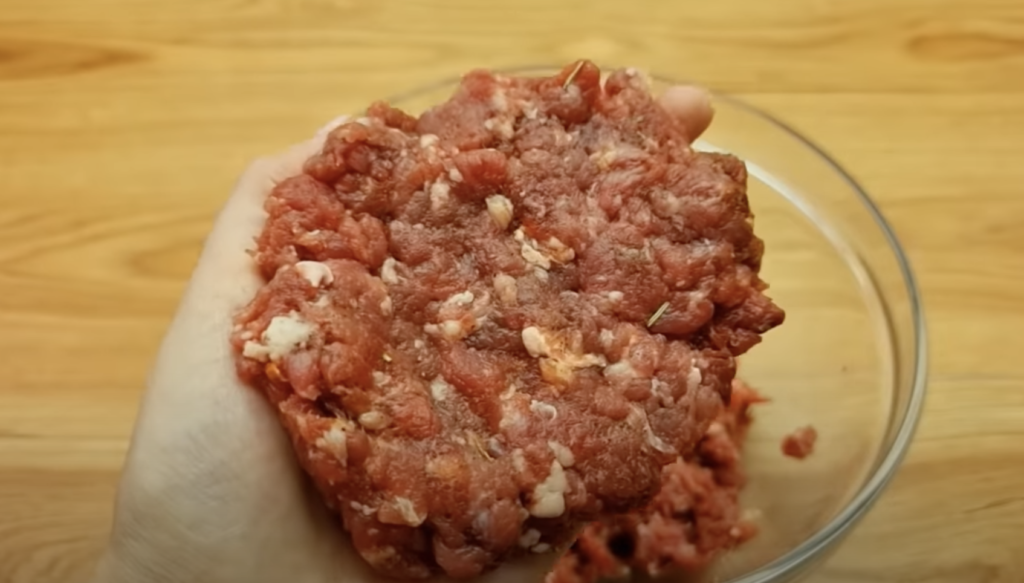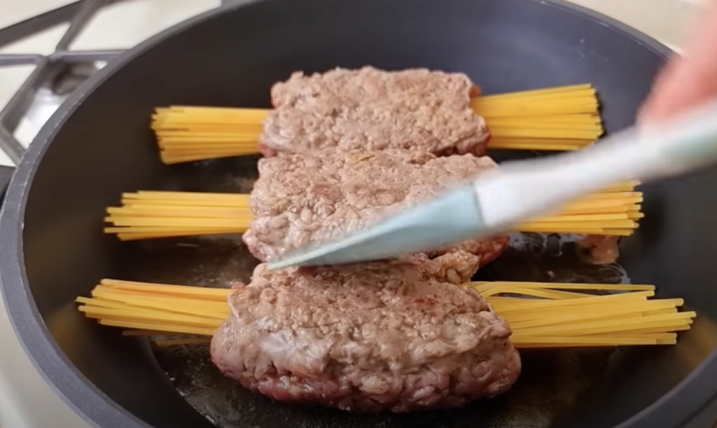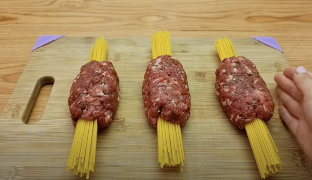 Następnie weźmy odrobinę spaghetti i wbijmy je w sam środek mięsa.