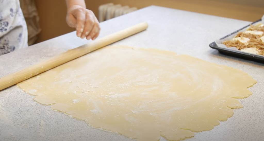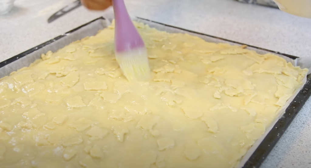 Drugą połowę ciasta należy rozwałkować i położyć na wierzchu nadzienia. Umieść ciasto na wierzchu nadzienia, odcinając nożem nadmiar ciasta. Przed pieczeniem, pamiętaj, aby nakłuć ciasto nożem i posmarować je jajkiem.