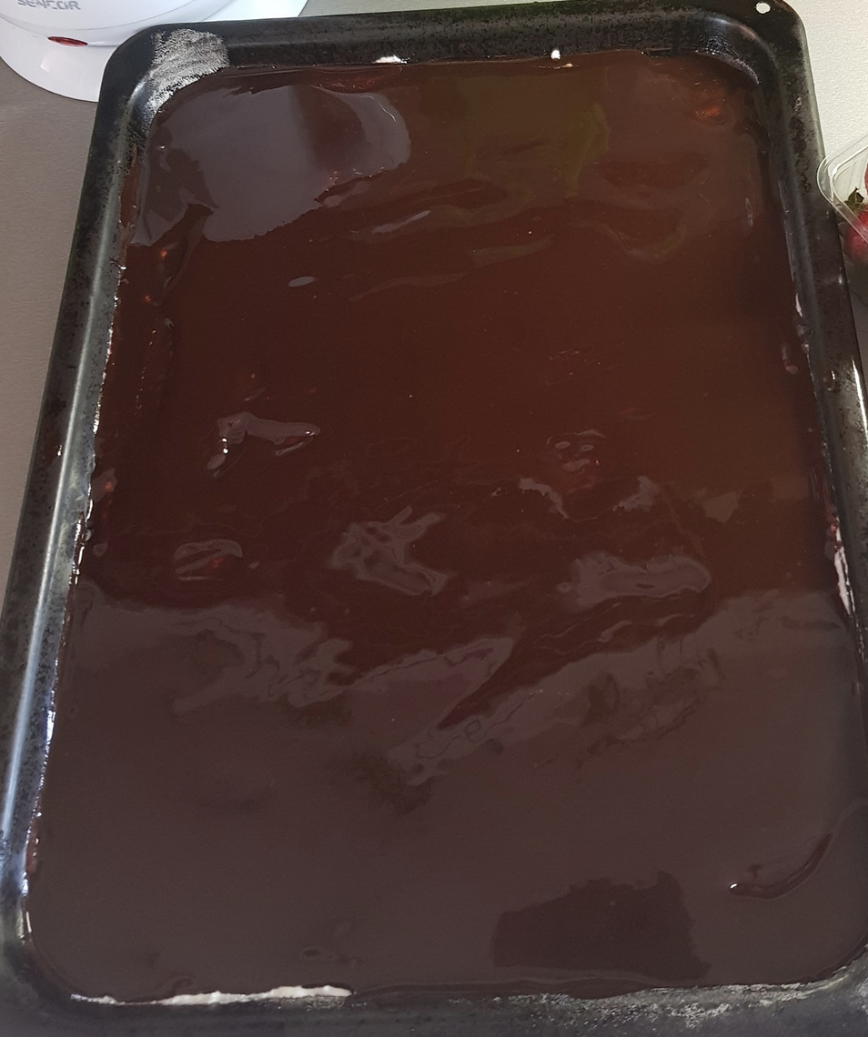 W ostatniej kolejności należy przygotować polewę do deseru. W tym celu podgrzewamy śmietankę w rondelku na niskiej temperaturze i ciągle mieszając dodawać do niej kawałki czekolady, do momentu aż wszystko się roztopi i połączy ze sobą. Opcjonalnie można przygotować polewę w mikrofalówce.