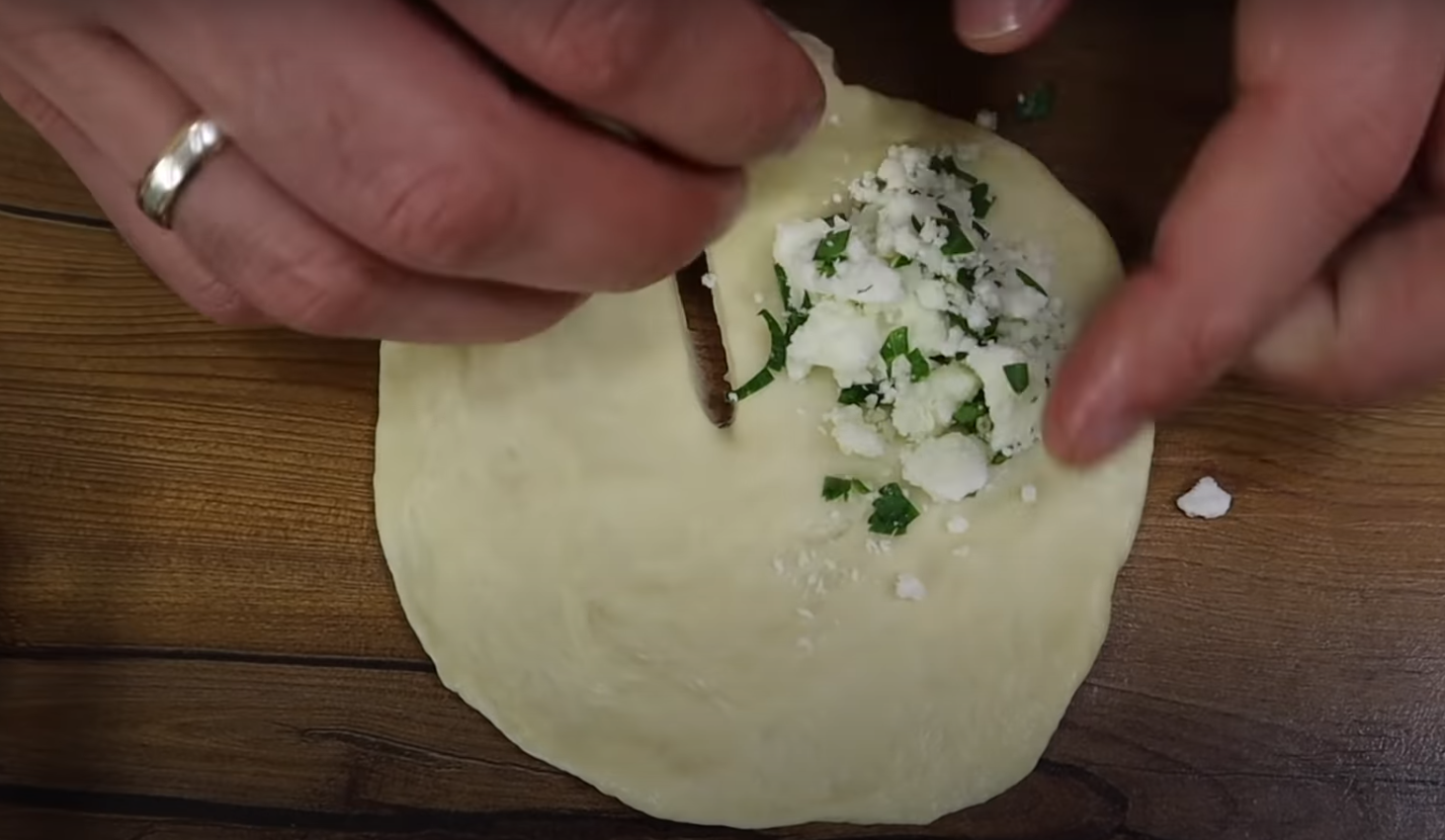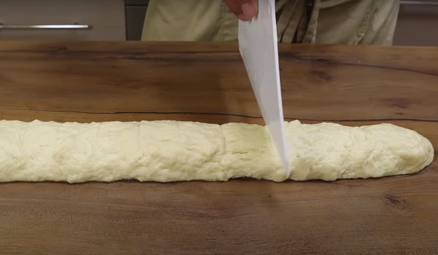 W czasie, gdy ciasto rośnie, wymieszaj posiekane zioła i ulubiony ser. Po 10 minutach wyjmij ciasto z piekarnika i rozwałkuj je na długi prostokąt. Następnie pokrój na małe kawałki co kilka centymetrów.