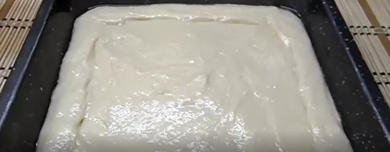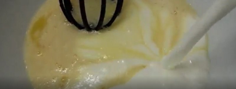 Jaja z solą ubijać aż będą puszyste, powoli dodawać cukier. Następnie nalać olej roślinny i mleko, ciągle ubijając. Dodać porcjami przesianą mąkę z proszkiem do pieczenia, mieszać do pozbycia się grudek. Ciasto należy mieszać dokładnie tak by pozbyć się grudek, ciasto ma być gęste, a konsystencja jednolita.