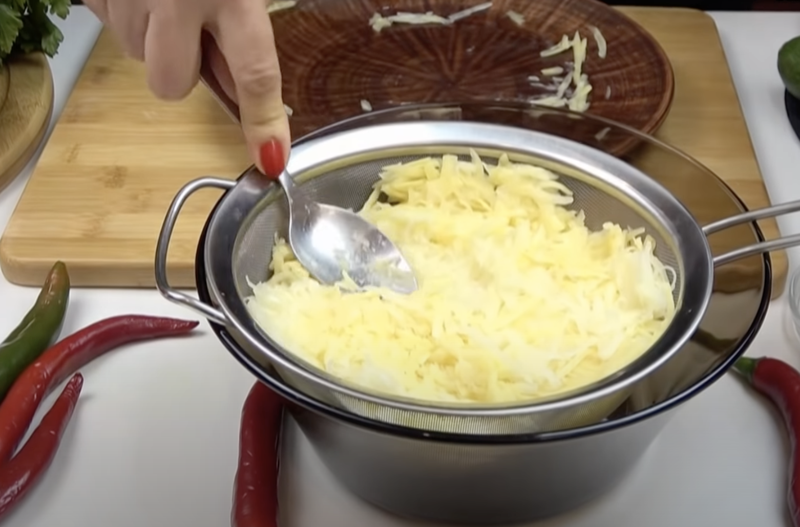 Za pomocą grubej tarki zetrzyj ziemniaki na tarce. Odsącz wodę z sita.