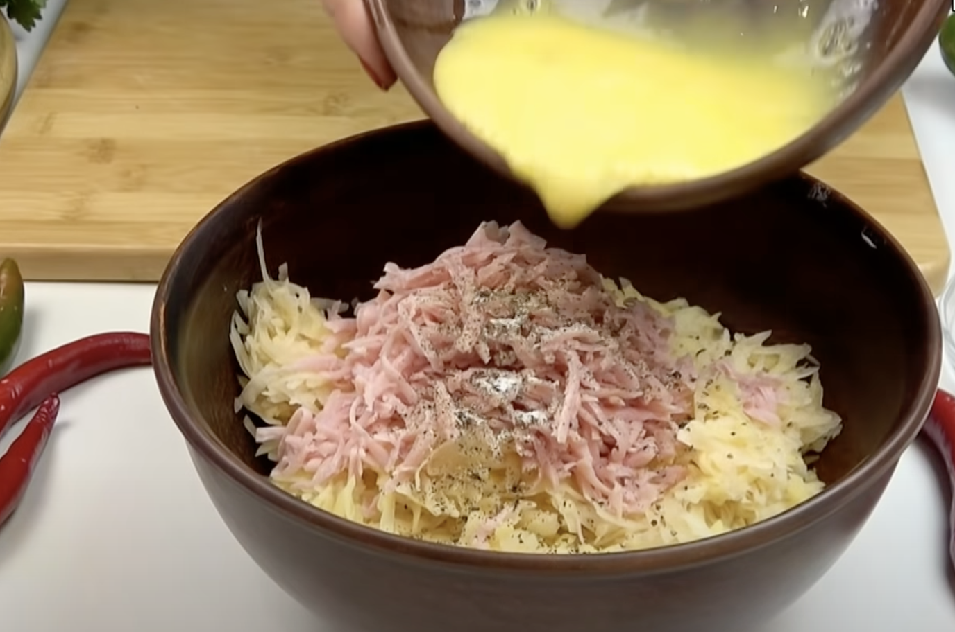Pokrój szynkę (opcjonalnie możesz dodać salami lub inną wędlinę), a następnie wymieszaj z ziemniakami. Doprawić solą i pieprzem do smaku i dobrze wymieszać.
