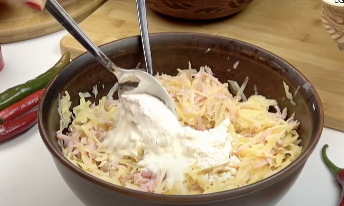 Do masy ziemniaczano-szynkowej dodać jajka, rozbijając je. Wmieszaj ser, mąkę i posiekaną natkę pietruszki. Wszystko połączyć.