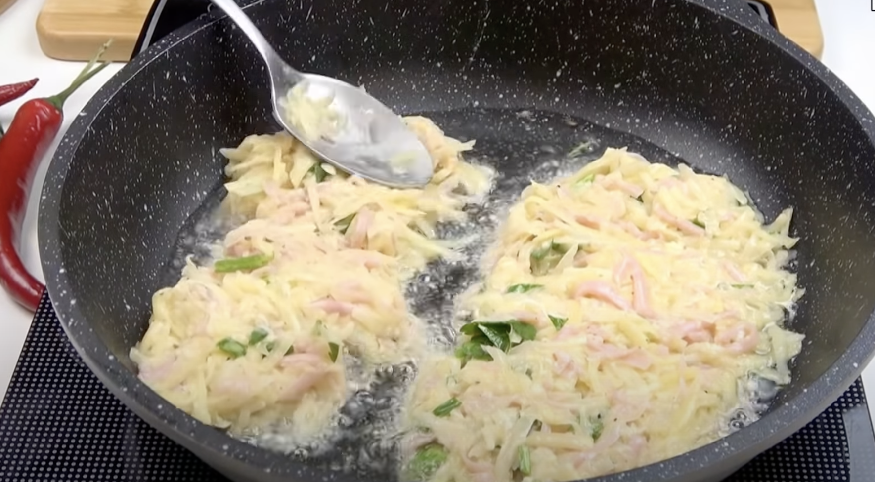 Na dużej patelni rozgrzej olej i uformuj placki za pomocą łyżki. Smaż je z obu stron na złoty kolor.