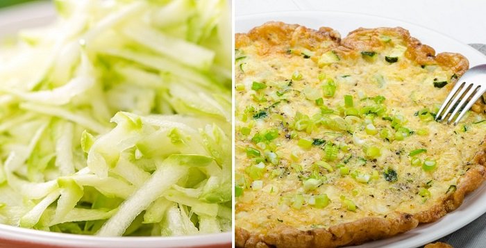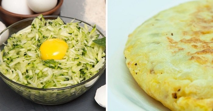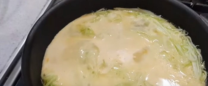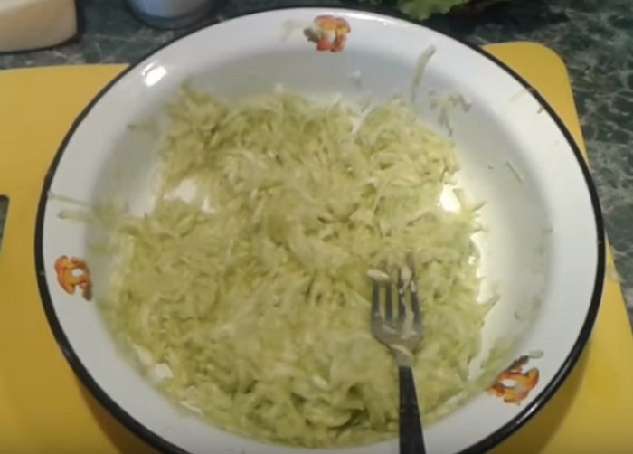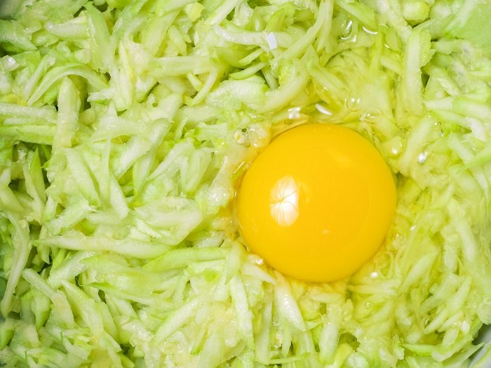 Wymieszaj cebulę i surową cukinię z jajkiem. Doprawić solą, pieprzem i innymi przyprawami do smaku. Podgrzany olej dodać do ciasta. Gdy ciasto stanie się jednolite na patelni, posypać je tartym serem.