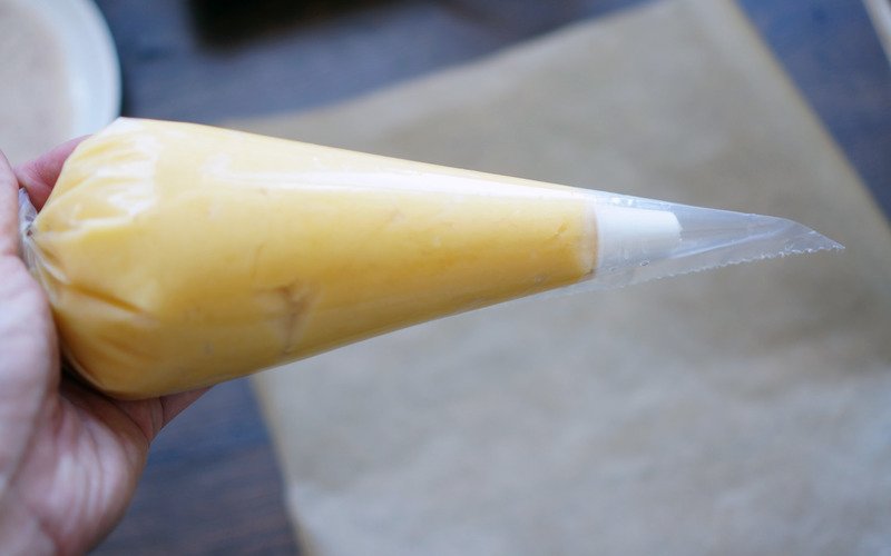 Wymieszaj masę z jajkami. Wymieszaj jajka osobno za pomocą łopatki. Umieścić masę w worku do pieczenia.