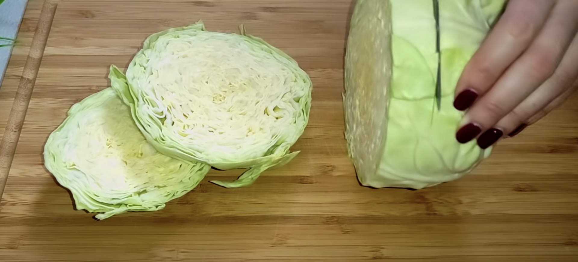Umyj główkę świeżej kapusty i zdejmij z niej wierzchnie liście. Jak już obcieknie z wody, pokrój ją w plastry grubości 1,5 palca (ok.2 cm).