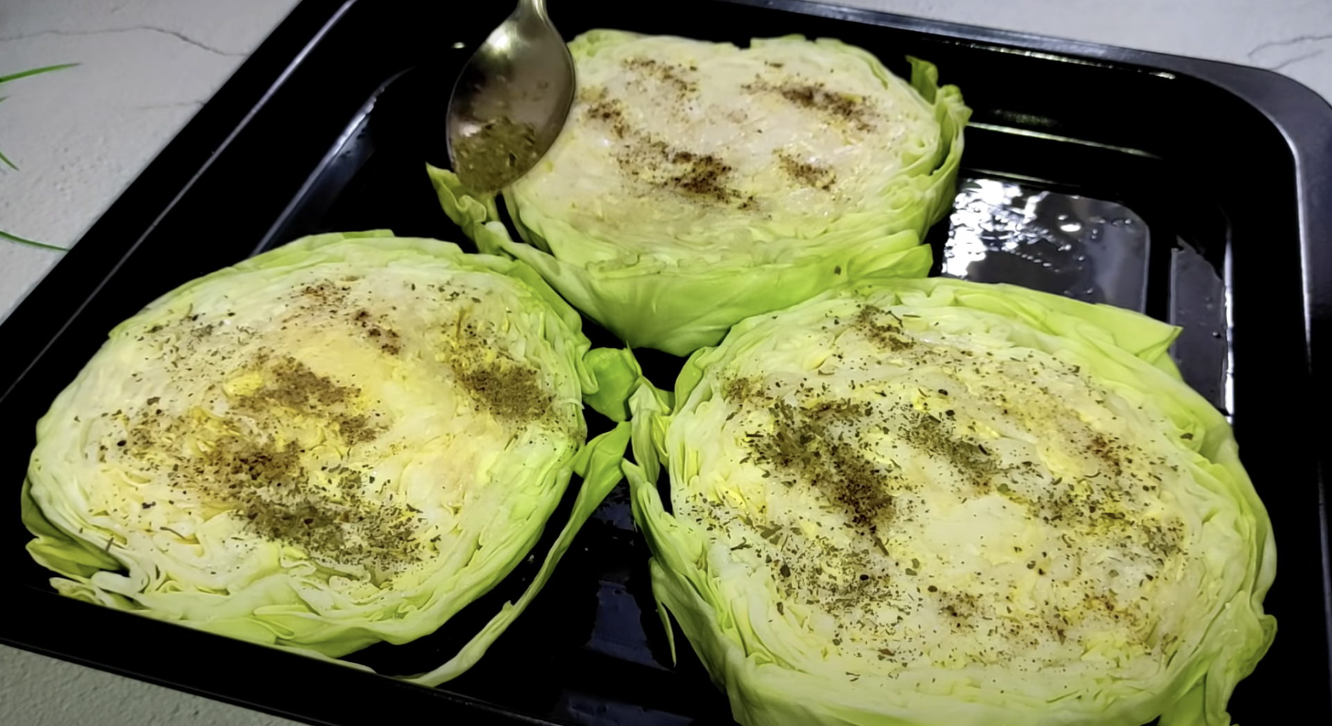Wysmaruj blachę oliwą z oliwek i ułóż na niej plastry kapusty. Następnie dobrze ją natrzyj zmiażdżonym czosnkiem połączonym z własną mieszanką przypraw i oliwą z oliwek.  Jeśli nie masz pomysłu jakich ziół użyć, wystarczy, że dodasz pieprzu i papryki.