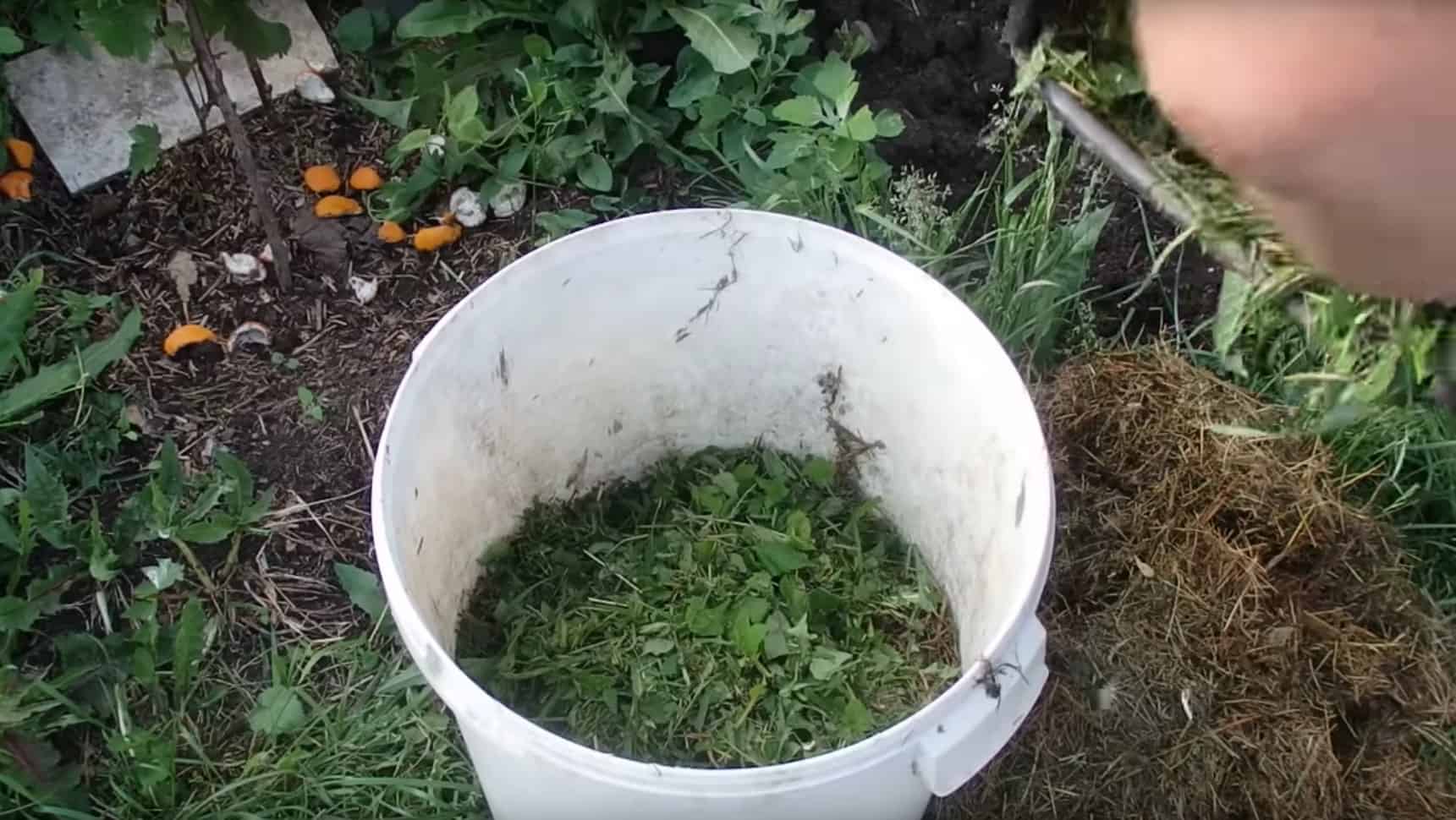 Przygotować duże plastikowe wiadro. Na dnie wiadra ułożyć warstwę skoszonej trawy na wysokość 1/3.