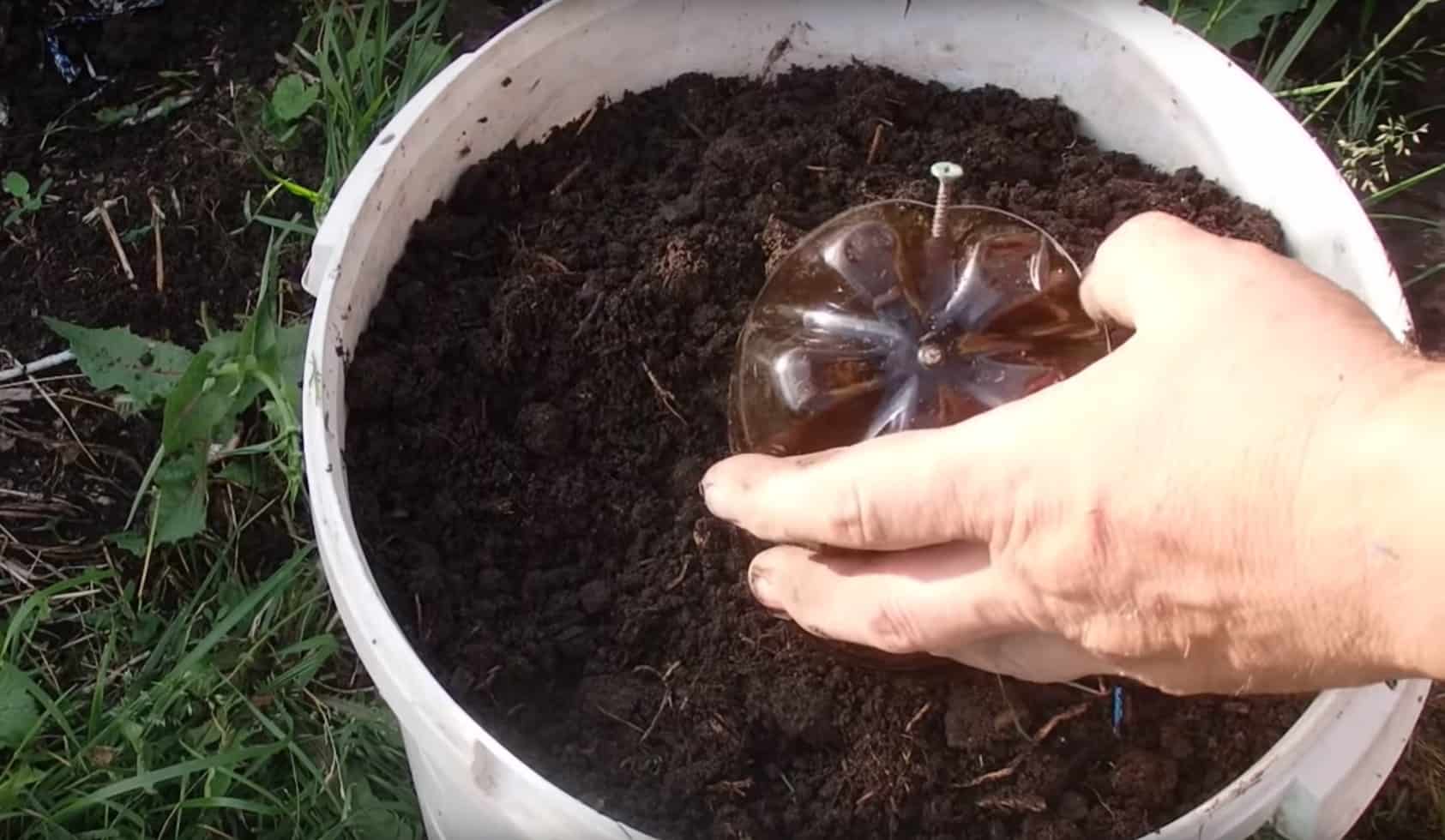 Rozpocząć nawadnianie – przygotować pustą 2l butelkę z zakrętką, wydrążyć śrubą otwór od spodu, napełnić wodą i osadzić w ziemi część z otworem na głębokość 10 cm, by stale utrzymywać w niej wilgoć. Zrobić niewielki dołek w ziemi i posadzić ogórkową sadzonkę. Warto ją mocno docisnąć po zasypaniu korzeni glebą.