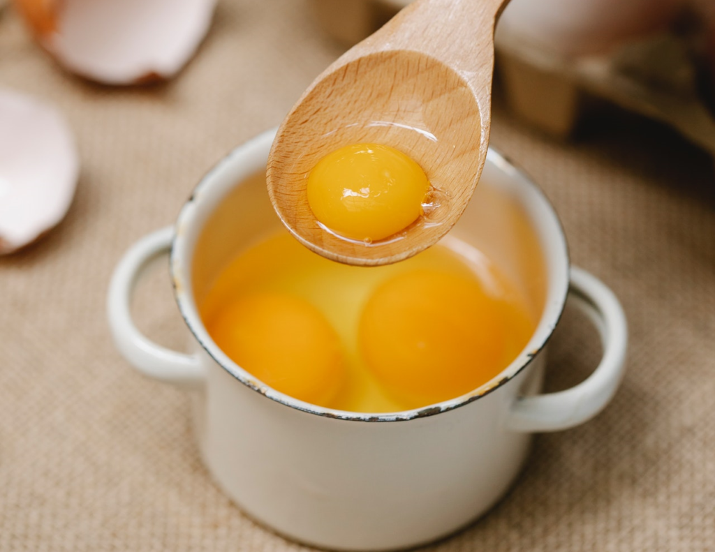 Mleko i olej wlej do miski, dodaj przesianą mąką i dokładnie połącz składniki w zwartą masę. Do masy dołącz 4 żółtka jaj oddzielone od białek.