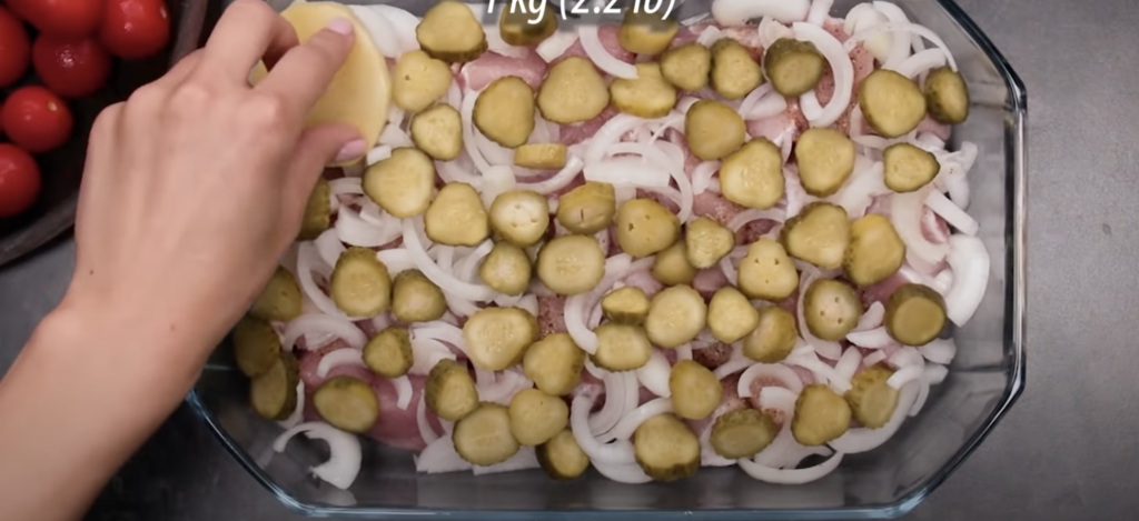 Pokrój ogórki w plasterki i ułóż również na mięsie.