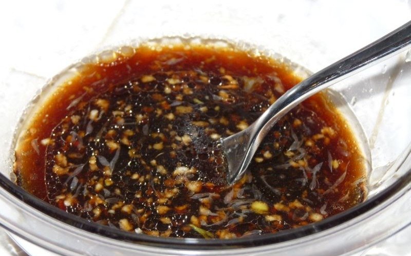 Przy pomocy praski, przeciśnij czosnek. Następnie wymieszaj go z cukrem i innymi przyprawami. Dodaj do tego skrobię oraz sojowy sos i wszystko wymieszaj.