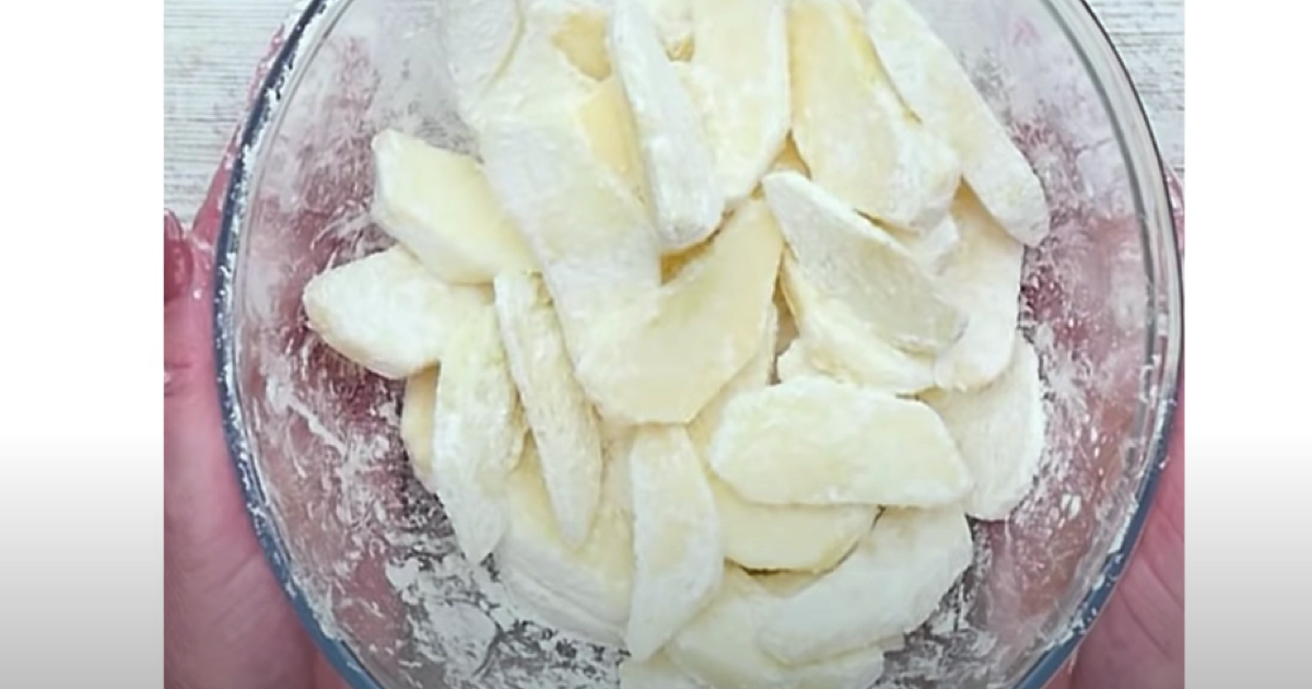 Dzięki temu nie powstaną grudki, a ciasto będzie puszyste. Konsystencja ma być gładka i wyglądem przypominać gęstą śmietanę. Obierz jabłka i pokrój je w cienkie plasterki. Rozłóż na talerzu i posyp je skrobią i wymieszaj, tak aby przykryła całość.