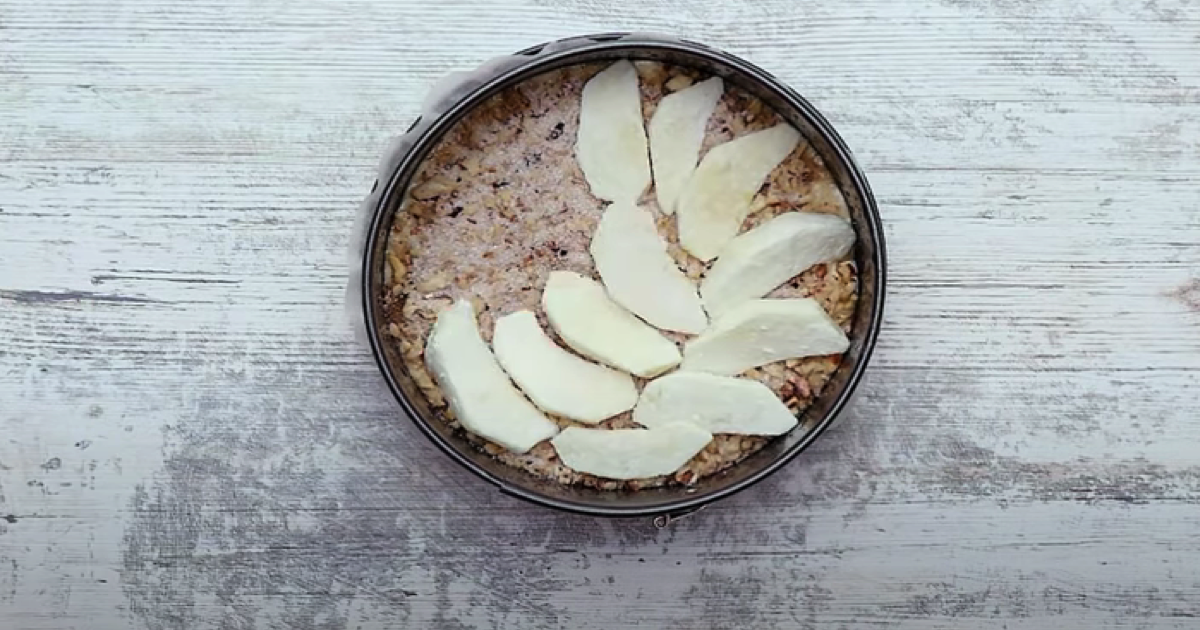 Wlej połowę ciasta do przygotowanej formy, na nim rozłóż połowę przygotowanych orzechów z cukrem i udekoruj połową jabłek. Na jabłka rozłóż odcedzone z wody (bądź koniaku) suszone owoce (całość). Następnie wlej drugą połowę ciasta, przykryj pozostałą częścią jabłek i posyp pozostałymi orzechami.