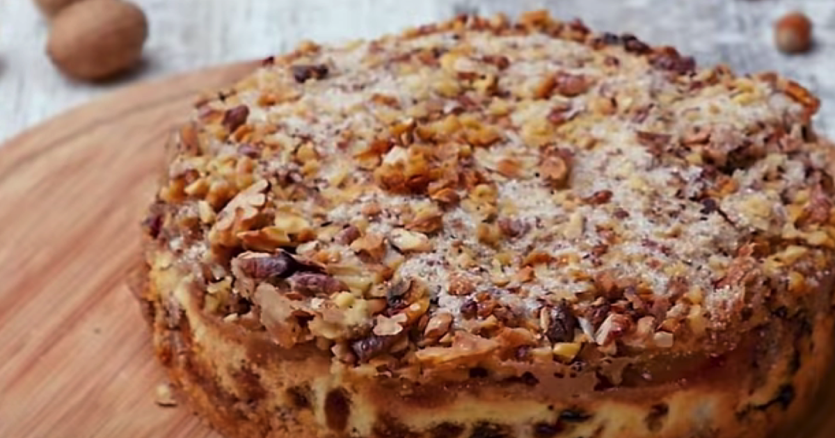 Do rozgrzanego na 180 stopni piekarnika włóż ciasto. Piecz 50-55 minut do suchego patyczka. Na pierwsze pół godziny pieczenia możesz przykryć ciasto folią – zabezpieczy to orzechy przed przypaleniem. Gotowe ciasto studź w temperaturze pokojowej. Po całkowitym wystygnięciu posyp cukrem pudrem do smaku.
