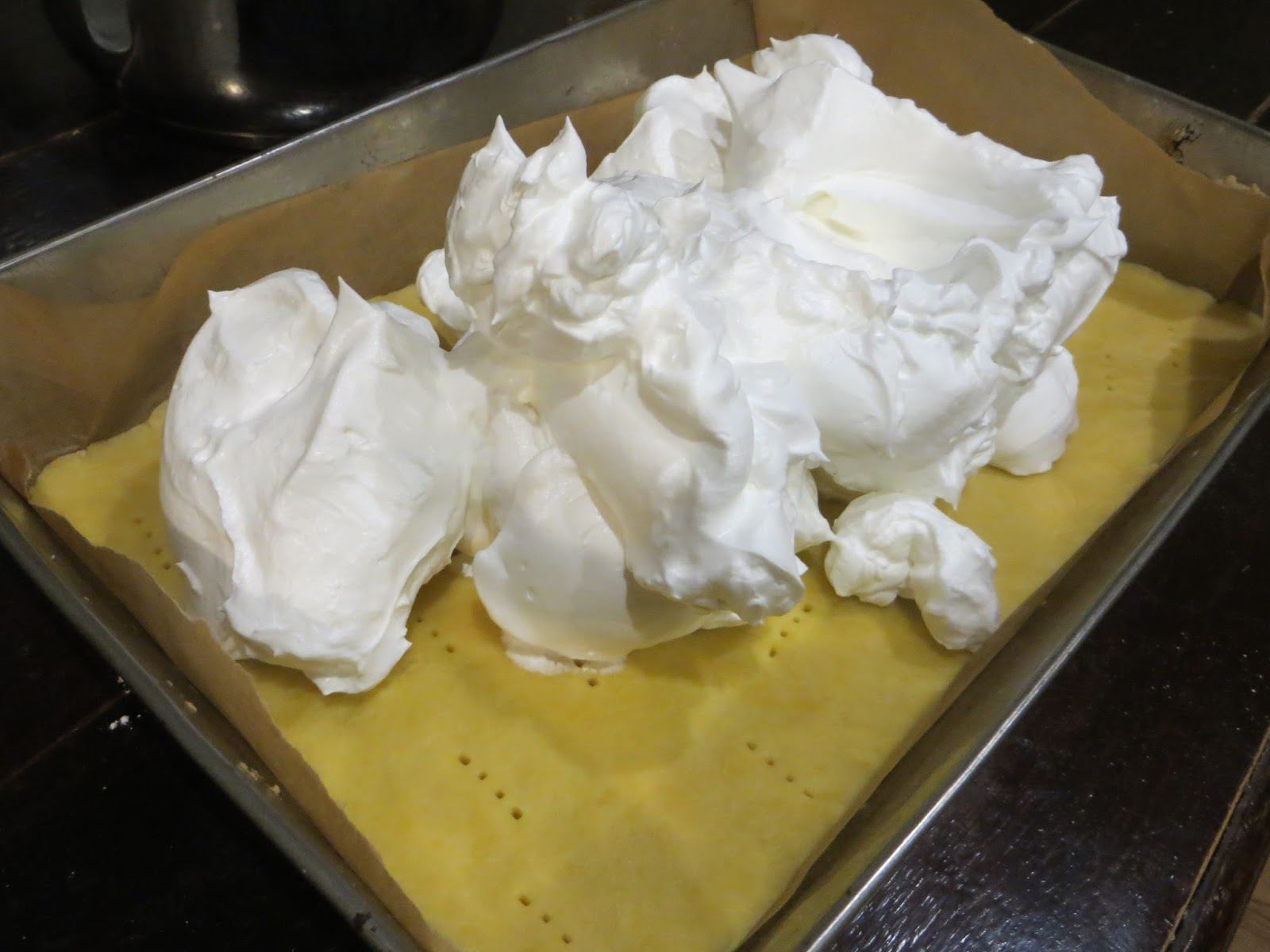 Z podanych składników przygotuj kruche ciasto. Ciasto podzielić na dwie części i włożyć do lodówki na około pół godziny. Obie połówki włóż do dwóch tortownic o wymiarach 25×36 cm. Piec jedną z form przez 30 minut w piekarniku. Wystudzić. Podczas gdy ciasto stygnie, przygotuj bezę migdałową.