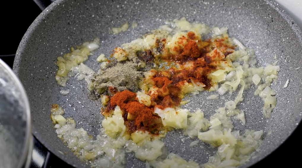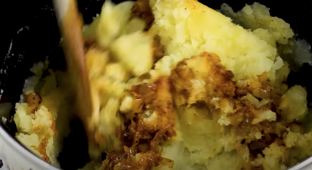Po około 5-6 minutach dodaj do cebuli łyżeczkę słodkiej ostrej papryki, płaską łyżeczkę pieprzu i łyżeczkę suszonej bazylii. Dokładnie wymieszaj, aby przyprawy dobrze się połączyły z cebulą. Do cebuli dodaj 5-6 pełnych łyżek śmietany (lub jogurtu naturalnego, jeśli wolisz). Mieszaj, aż wszystko się połączy i powstanie gładka masa. Gdy ziemniaki będą ugotowane, odcedź je i przemyj w zimnej wodzie. Dodaj sól do smaku i ugnieć ziemniaki na gładkie puree. Następnie dodaj cebulową mieszankę do puree i dokładnie wymieszaj.