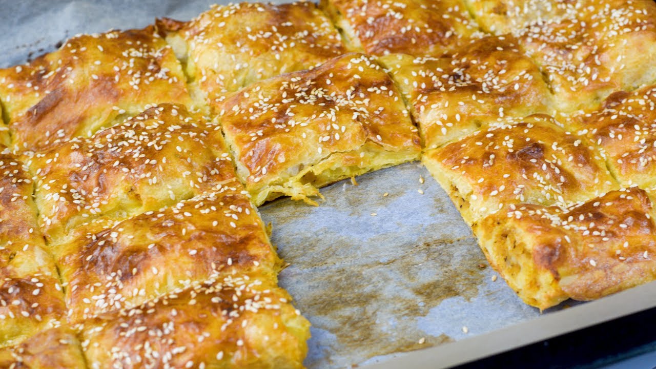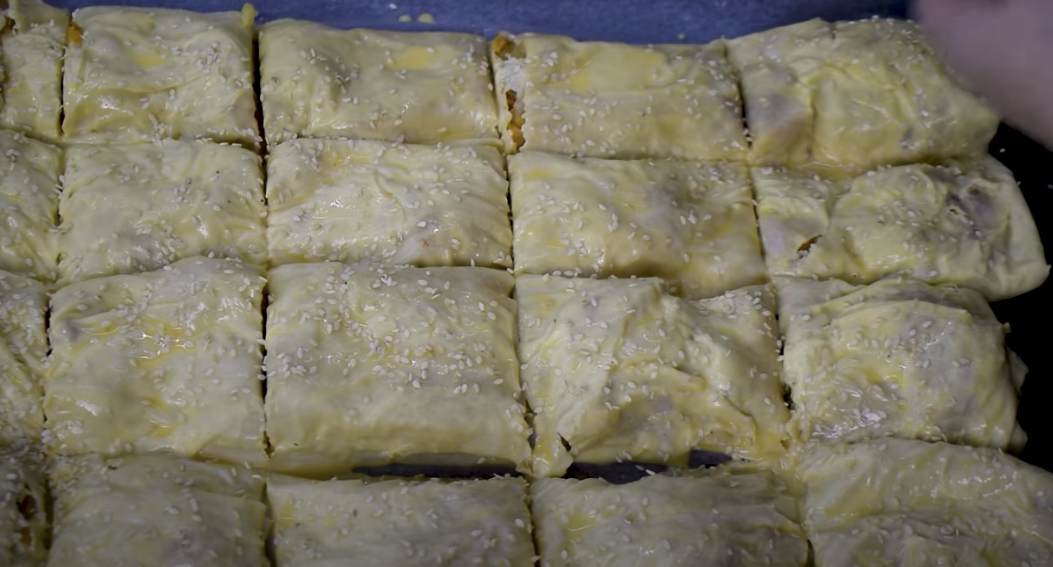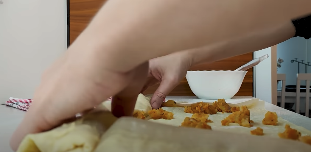 Rozłóż jedno ciasto filo (skórkę) na płaskiej powierzchni. Nałóż na nie 3 łyżki przygotowanego nadzienia ziemniaczanego i równomiernie rozprowadź. Nałóż kolejną skórkę, powtórz procedurę, a następnie na trzecią skórkę nałóż resztę nadzienia. Zwiń ciasto z nadzieniem w formę rolady, zaczynając od jednej strony i dociskając, aby było zwarte. Przełóż roladę na blaszkę wyłożoną papierem do pieczenia.