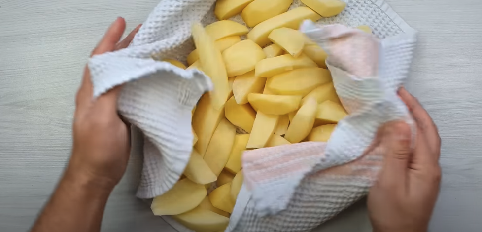 Najpierw obierz ziemniaki, upewniając się, że są dobrze oczyszczone z wszelkich zanieczyszczeń. Pokrój ziemniaki na cienkie frytki lub mniejsze kawałki, w zależności od tego, jaką formę chcesz uzyskać. Im cieńsze kawałki, tym bardziej chrupiące będą po upieczeniu.