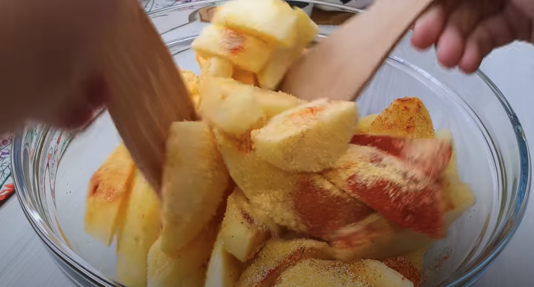 Po pokrojeniu ziemniaków, dobrze je wysusz za pomocą papierowych ręczników. To ważny krok, aby ziemniaki były chrupiące, ponieważ usunięcie nadmiaru wilgoci pozwala im lepiej się upiec. W misce wymieszaj olej z solą, pieprzem, vegetą i słodką papryką. Ilość przypraw dostosuj do swojego smaku. Jeśli chcesz, możesz dodać też inne ulubione przyprawy.