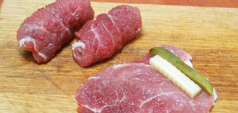 Ogórki pokrój na cztery części każdy, ser także pokrój a drobne paski. Kiedy minie pół godziny, dopraw mięso solą. Każdy plaster mięsa rozłóż i na jego brzegu umieść kawałek ogórka i sera. Następnie zwiń w rulonik i zabezpiecz nitką. Końcówki zabezpiecz przy pomocy wykałaczek. Usmaż roladki na rozgrzanym uprzednio oleju tak, by z każdej strony były odpowiednio zrumienione.